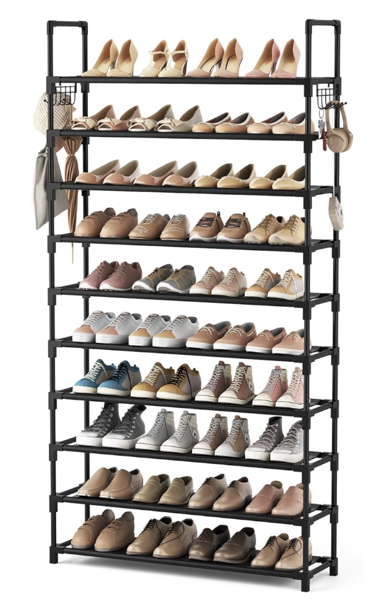 10-Tier Shoe Rack – Large Capacity 50 Pair Organizer with Two Hooks – Sturdy Metal Shoe Shelf for Entryway, Closet, Bedroom