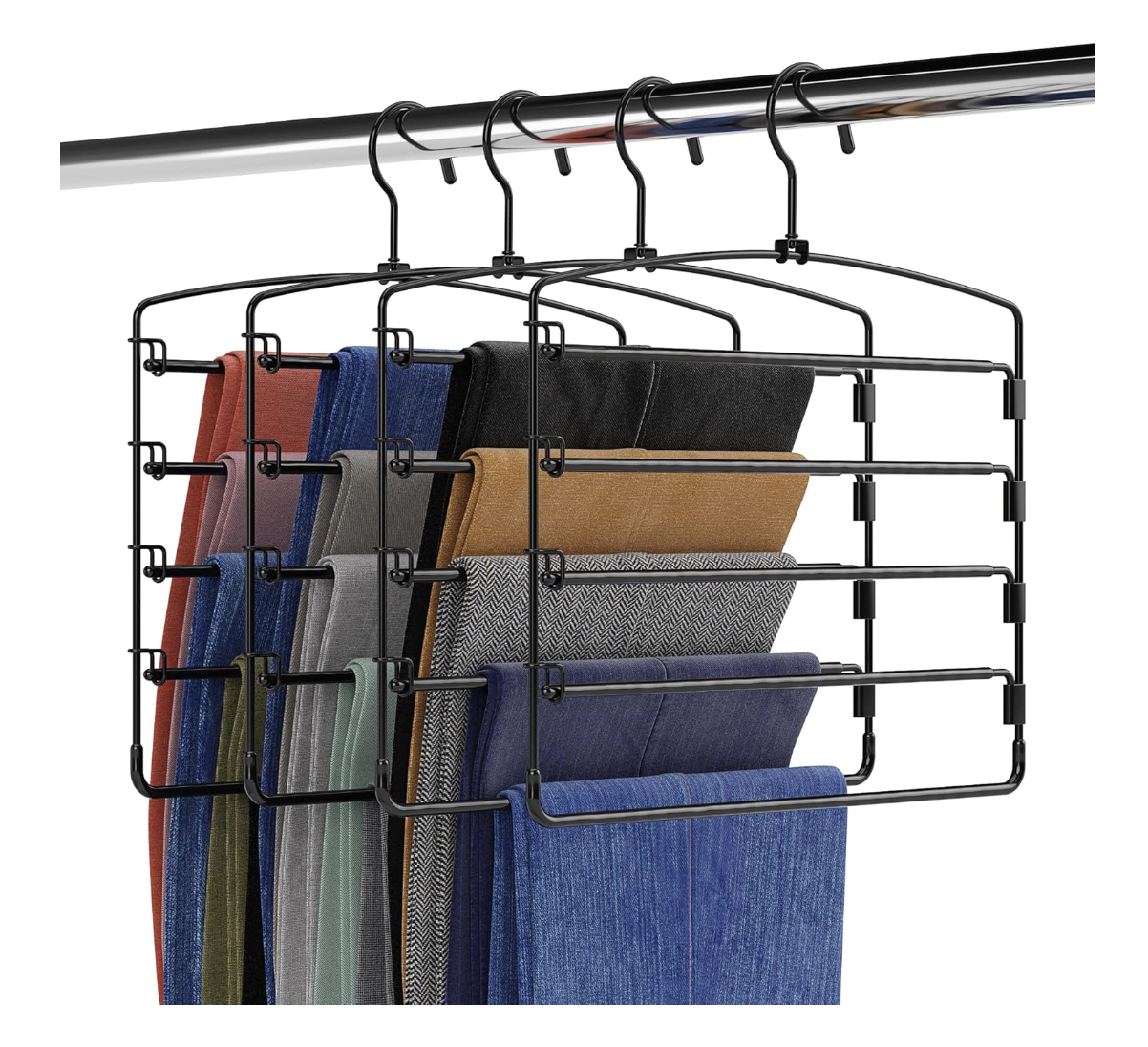 5 Tier Pants Hangers 4 Pack – Ultra Slim & Space Saving – Heavy Duty Metal Swivel Hook with Swing Arm for Clothing, Jeans, Slacks, Skirts, Leggings & Dress Pant Closet Organization