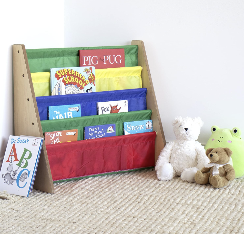 Humble Crew 4-Tier Kids Bookshelf, Natural Wood/Primary – Premium Book Shelf for Kids Rooms with Four Deep Pockets – Toddler Sling Book Rack with Deep Sleeves, Nursery Bookcase Organizer