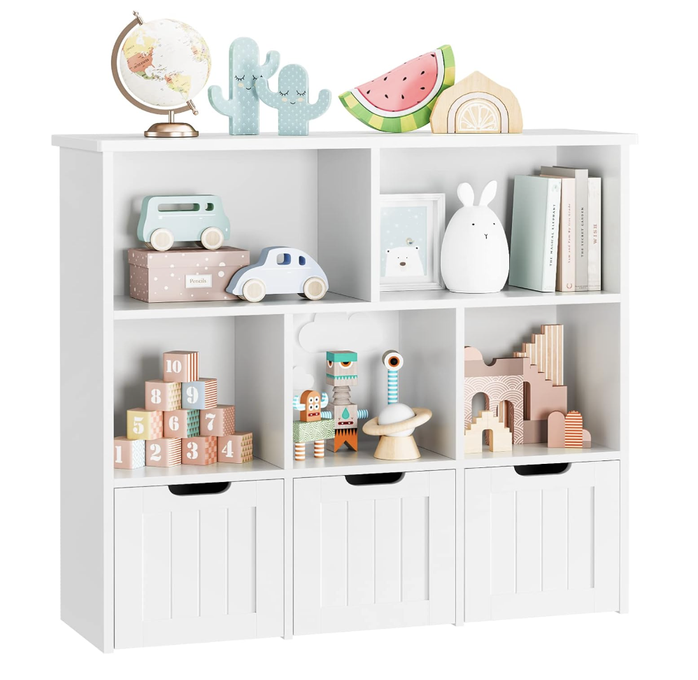 Toy Storage Organizer with 3 Movable Drawers, Floor Storage Cabinet Toy Chest with Hidden Wheels and 5 Storage Cubbies, Multifunctional Storage Chest for Playroom, White