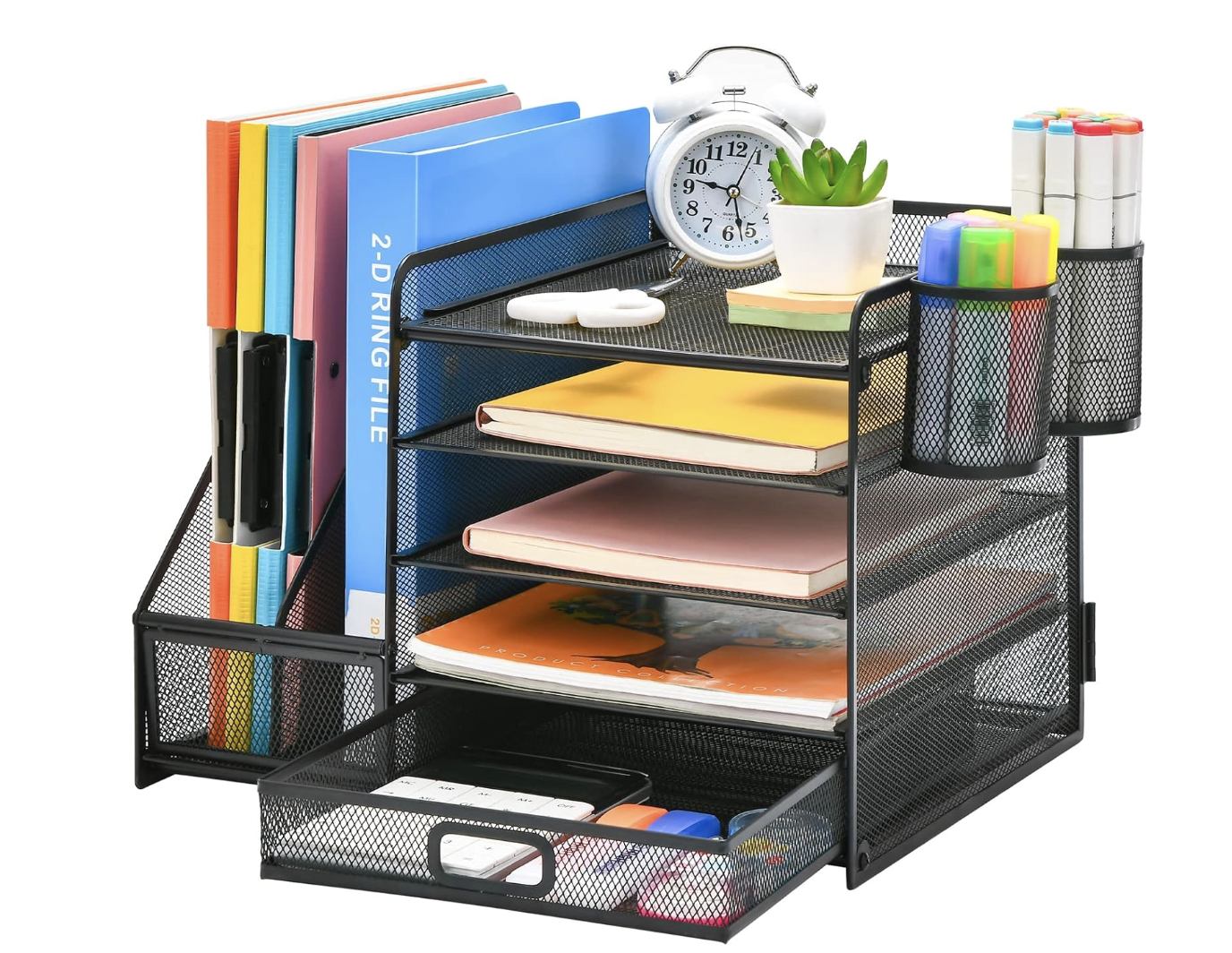 Desk Organizer with File Holder, 5-Tier Paper Letter Tray Organizer with Drawer and 2 Pen Holder, Mesh Desktop Organizer and Storage with Magazine Holder for Office Supplies(Black)