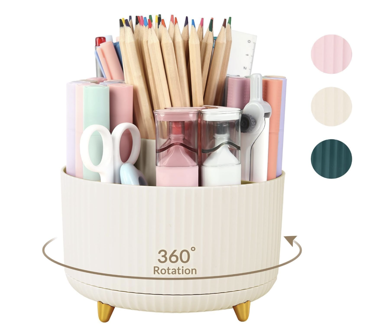360 Degree Rotating Desk Organizer, Dual-Purpose Pencil Pen Holder for Desk, Rotating Desk Pen Organizer with 5 Slots, Pencil Cup for Office, School, Home Beige