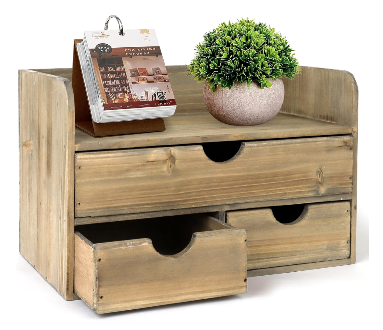 Wooden Office Desk Organizer – Organizing Tool for Desktop, Cubicle, Bedroom, Kitchen – Vintage Style Organization Caddy with Top Tray Shelf & 3 Drawers – 13.6x9x7 Inches (Rustic Burnt)