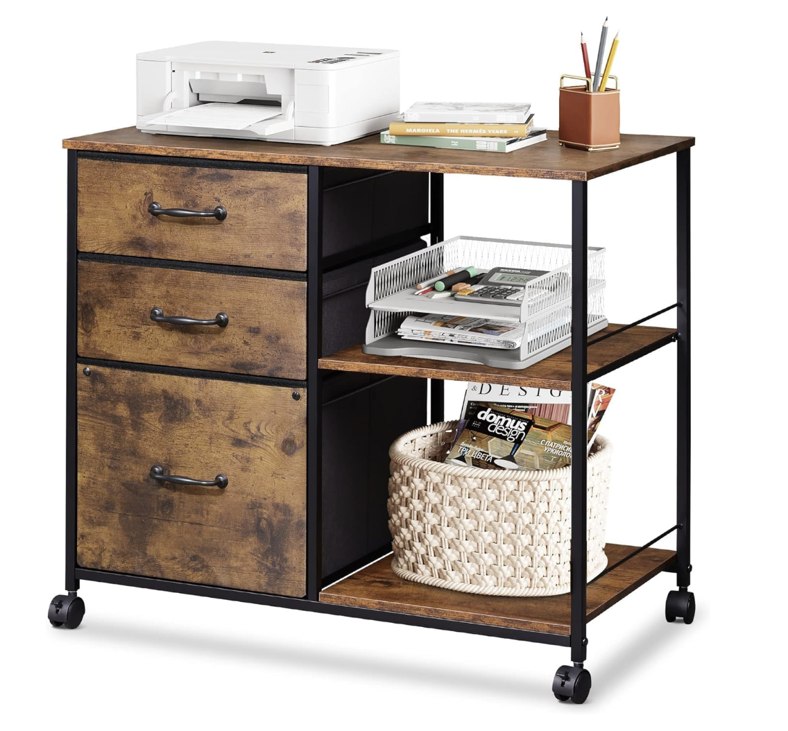 3 Drawer Mobile File Cabinet, Rolling Printer Stand with Open Storage Shelf, Fabric Lateral Filing Cabinet fits A4 or Letter Size for Home Office, Rustic Brown Wood Grain Print